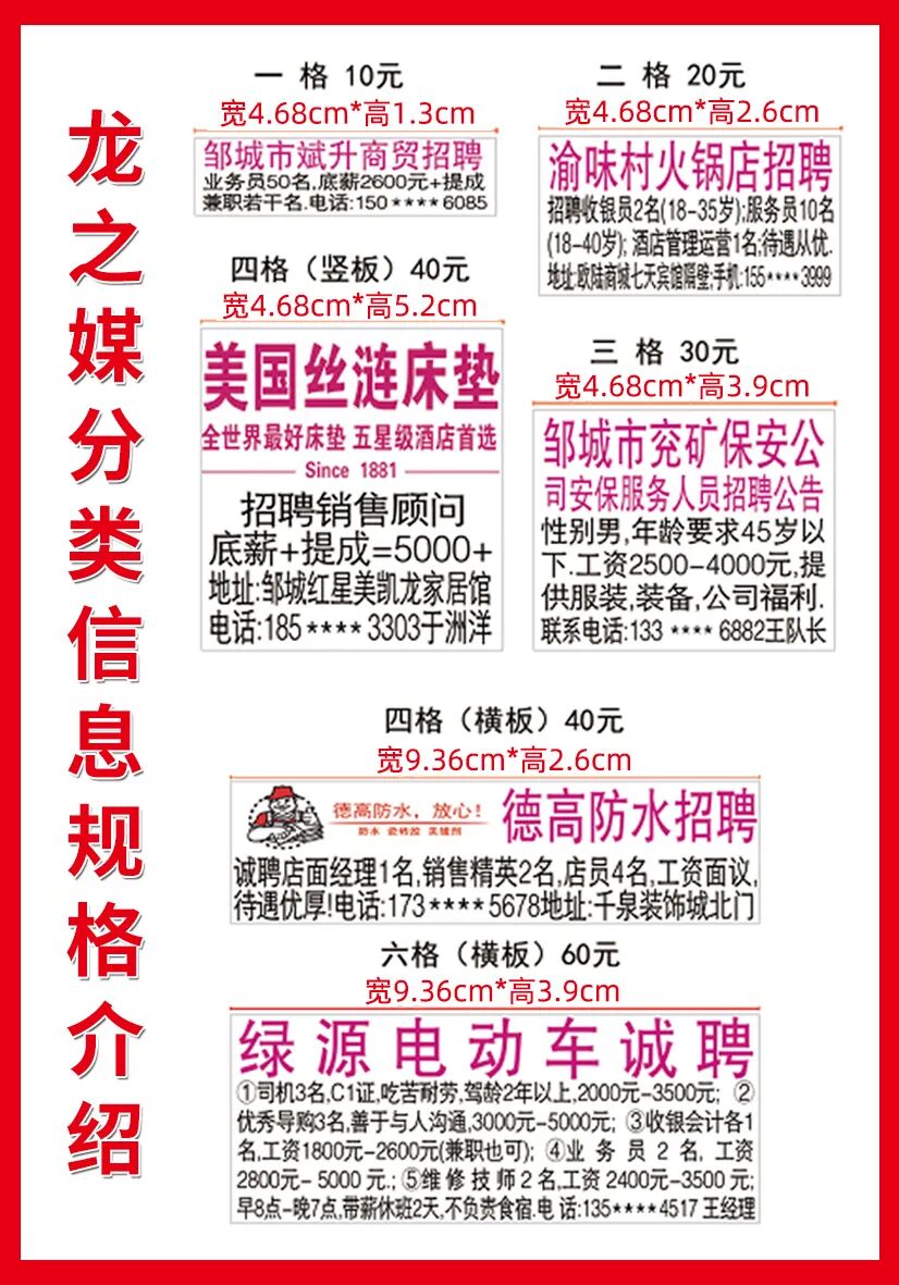 5.发行范围:邹城市区沿街店铺,电子版发布到龙之媒微信公众平台、同城信息平台上。
