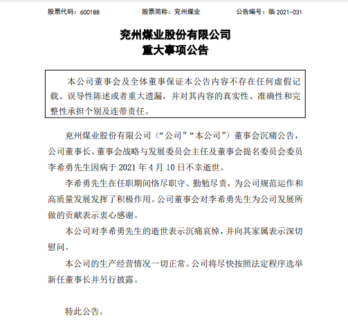 4月11日,兖州煤业股份有限公司在上交所发布重大事项公告:兖州煤业股份有限公司董事会沉痛公告,公司董事长、董事会战略与发展委员会主任及董事会提名委员会委员李希勇先生因病于 2021年4月10日不幸逝世。
